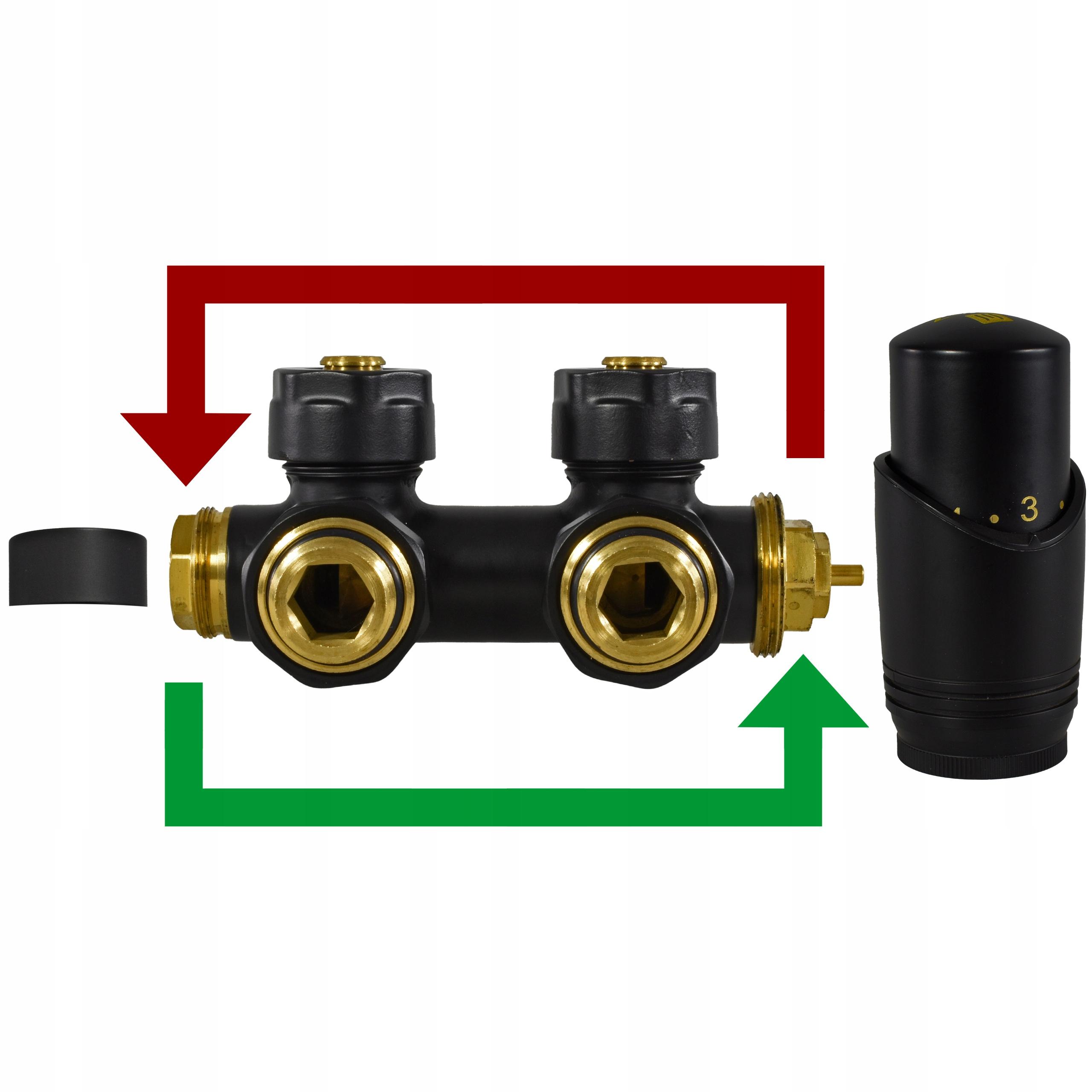 Uniwersalny czarny zawór przyłączeniowy grzejnika 1/2" M30x1.5. Odwracalny LEWO-PRAWO, z kompletem złączek PEX 16 i CU 15. Solidny mosiężny korpus, estetyczne wykończenie. Idealny do grzejników łazienkowych.