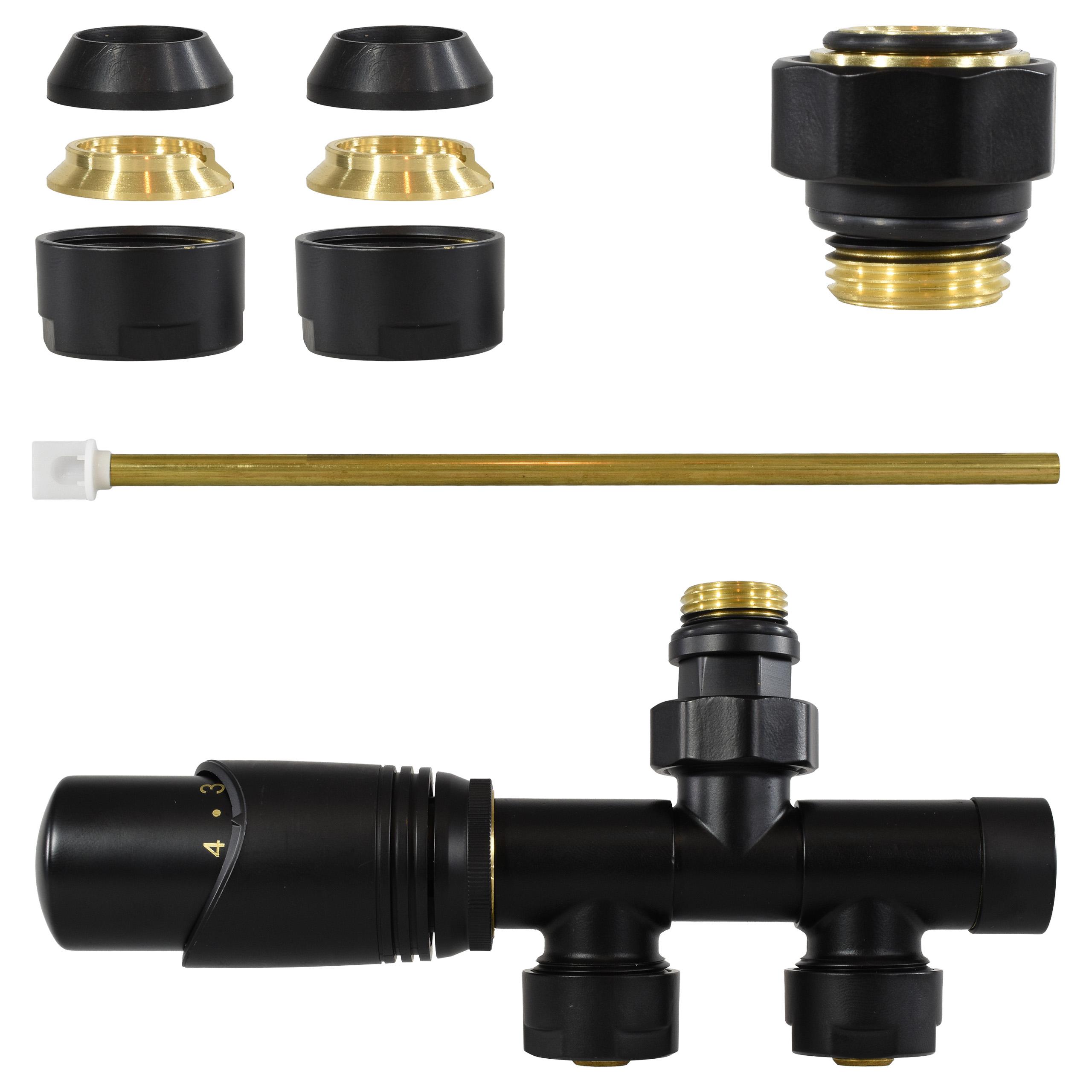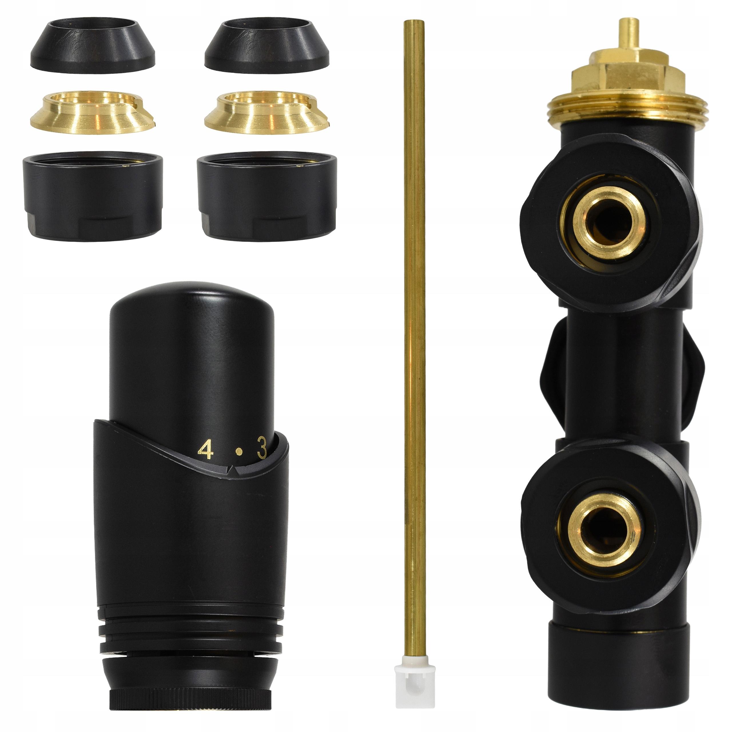 Elegancki zestaw termostatyczny w kolorze czarny mat do podłączenia grzejnika do instalacji oraz wygodnej regulacji temperatury w pomieszczeniu.